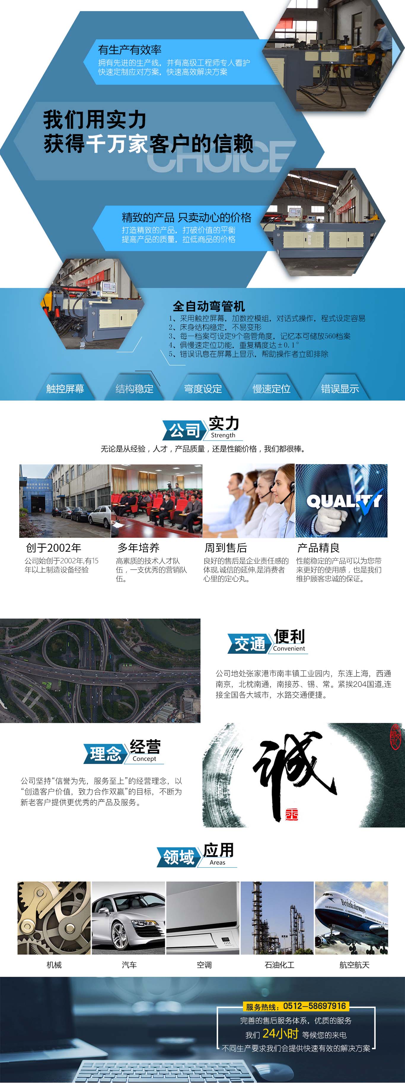 張家港市雙和機械制造有限公司始建于2001年,占地面積12000平方米,南鄰蘇州、無錫、上海,東鄰常州、南京,交通便利,位長三角中間地段,風景優(yōu)美的張家港。 雙和公司至創(chuàng)立開始,引進了國外的設計制造理念,組建了企業(yè)生產(chǎn)管理優(yōu)秀團隊,致力于管材加工機械研發(fā)、設計、制造。創(chuàng)新的設計理念,嚴格的質量把關,專業(yè)的售后服務,不斷提升了我在整個行業(yè)的影響力。 雙和公司生產(chǎn)的系列產(chǎn)品分為彎管機、切管機、縮管機、磨齒機、伺服彎管機、數(shù)控彎管機、液壓彎管機、自動切管機、管端成型機、倒角機、大弧滾圓機、鋁切機、壓彎機等管材加工機械,廣泛用于航天業(yè)、造船業(yè)、汽車制造、鍋爐制造、自行車、摩托車、體育健身器材、管制品家...